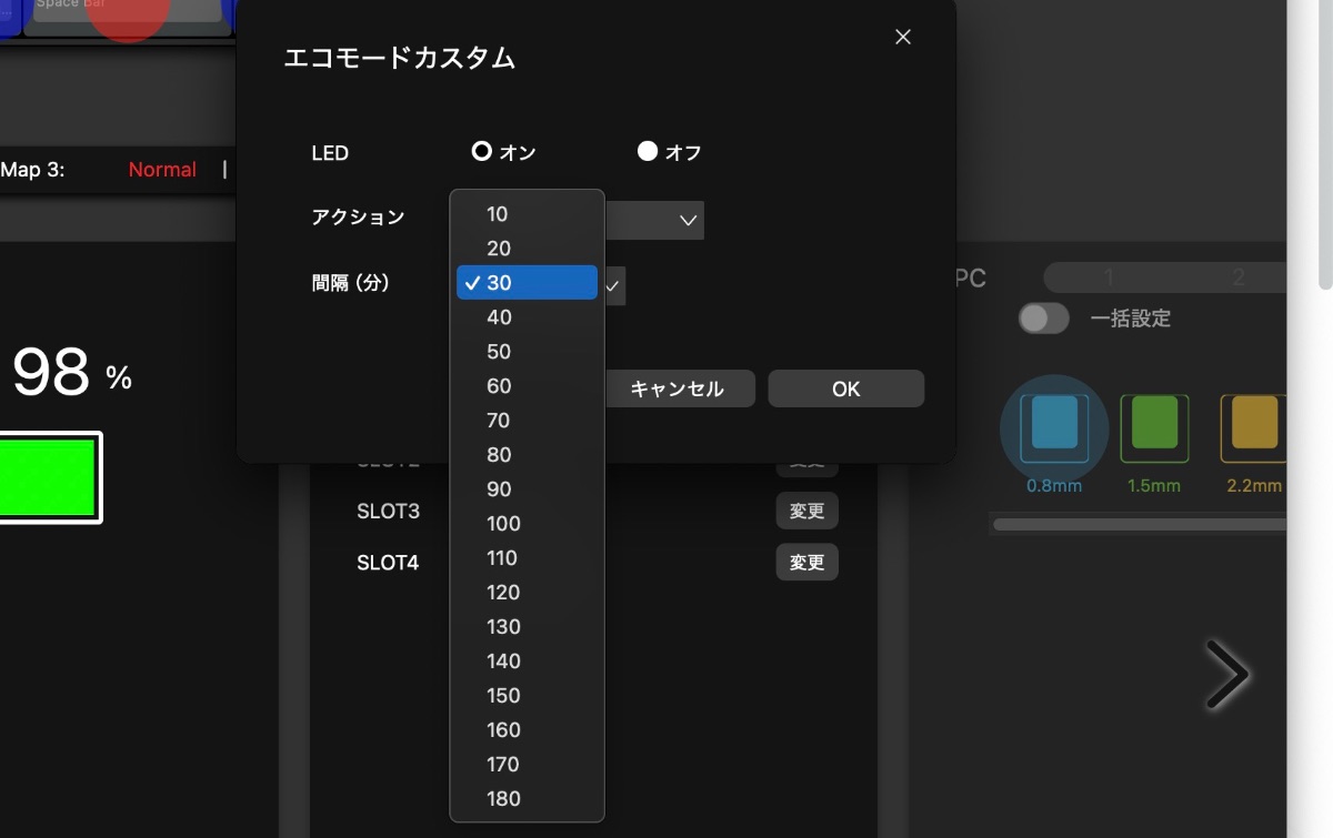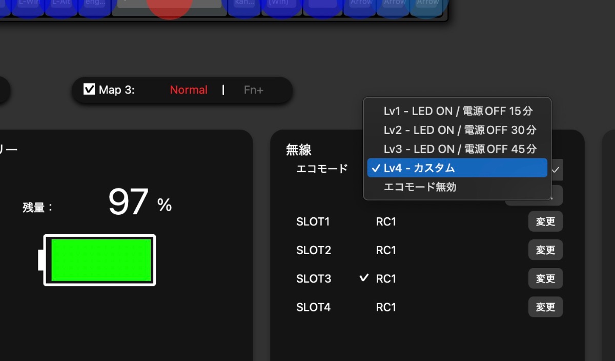 どうもエコモード無効はLED、つまりCapsやNumなどが点灯する仕様になっているのに対し、カスタマイズの常時電源オンではこのLEDのオンオフの選択ができる点が違うようです。なので、より節電して長く使いたいならカスタマイズの常時電源オンでLEDオフにして使うと良いでしょう。