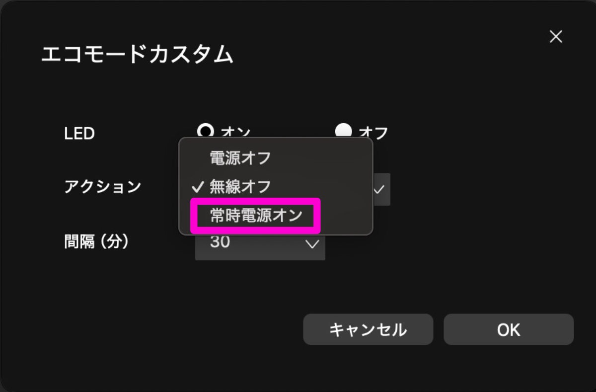 実は、カスタマイズの設定にも常時電源オンというモードがあって、どこが違うかというと、